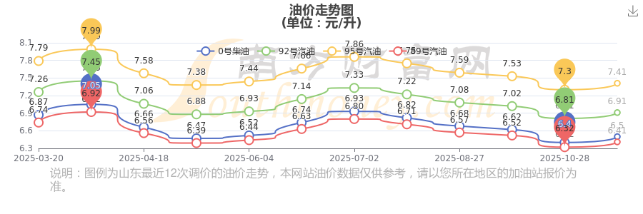 山东东营95号汽油11月15日的价格为11月11日调整后的价格,具体为7.41元/升,相对上次调整增了0.11元。下一轮油价调整时间11月24日24时,距离现在还有9.58天。