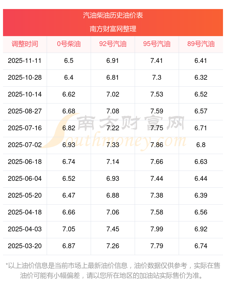 2025年95号汽油价格一览表