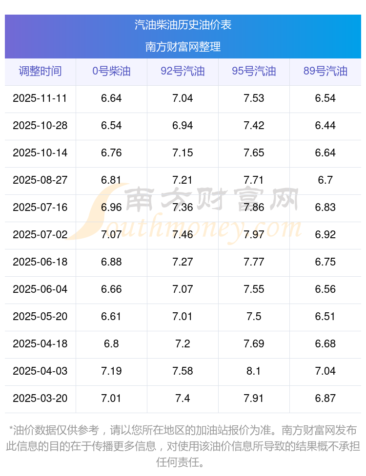 11月15日,四川巴中汽油、柴油每升最新价格:本轮的油价调整时间是11月11日,92号汽油为7.04元,上涨了0.1元,上涨幅达1.44%;95号汽油为7.53元,上涨了0.11元,上涨幅达1.48%;89号汽油为6.54元,上涨了0.1元,上涨幅达1.55%;0号柴油为6.64元,上涨了0.1元,上涨幅达1.53%。下一轮油价调整时间11月24日24时,距离现在还有9.58天。