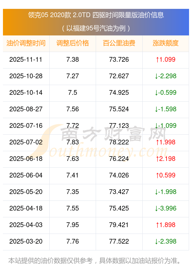 根据11月11日95号汽油最新调整价格7.38元/升来计算(以福建为例),该车型每百公里的平均油费是73.726元,上一轮10月28日调整价格7.27元每升来计算,每百公里的平均油费是72.627元,对比上一轮多花1.099元,下一轮的油价调整时间是11月24日24时。