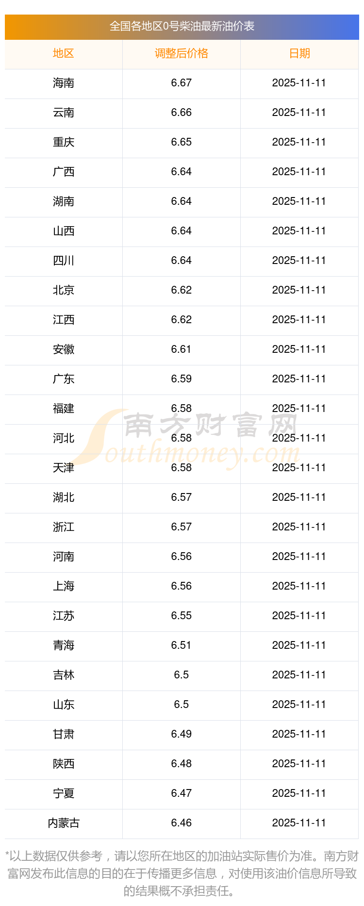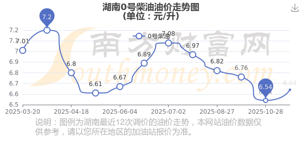 11月15日,湖南0号柴油的价格是6.64元每升,本次的调整时间为11月11日,对比上次的调整上升了0.1元,上升1.583%,11月24日24时为下一轮油价调整时间,还有9.58天。