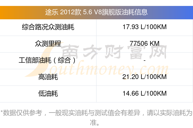 根据多位车主实测得出数据,该车型低油耗为14.66升每百公里,高油耗为21.20升每百公里,综合路况众测油耗为17.93升每百公里。