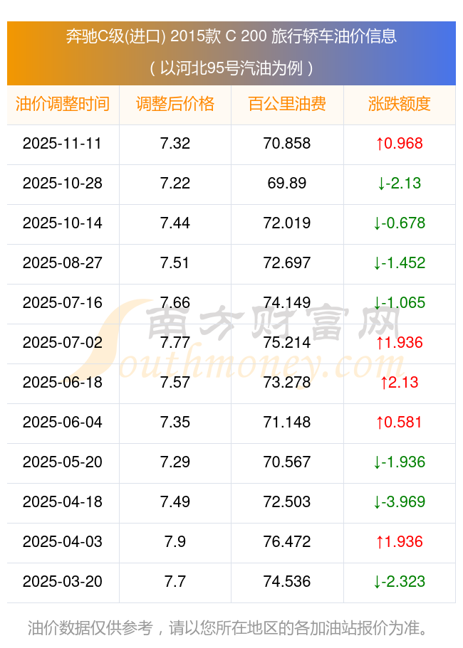 按11月11日95号汽油最新调整价格7.32元每升来计算(以河北为例),该车型百公里平均油费为70.858元,按上一轮10月28日调整价格7.22元每升来计算,百公里平均油费为69.89元,对比上一轮多花0.968元,下一轮油价调整时间为11月24日24时。