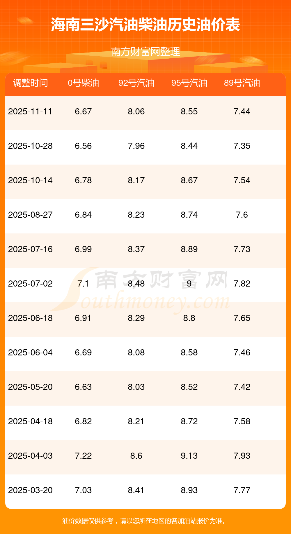 11月15日海南三沙汽油、柴油的价格是11月11日调整后的价格,每升价格为:92号汽油为8.06元,上升了0.1元,上升幅达1.26%;95号汽油为8.55元,上升了0.11元,上升幅达1.3%;89号汽油为7.44元,上升了0.09元,上升幅达1.22%;0号柴油为6.67元,上升了0.11元,上升幅达1.68%。