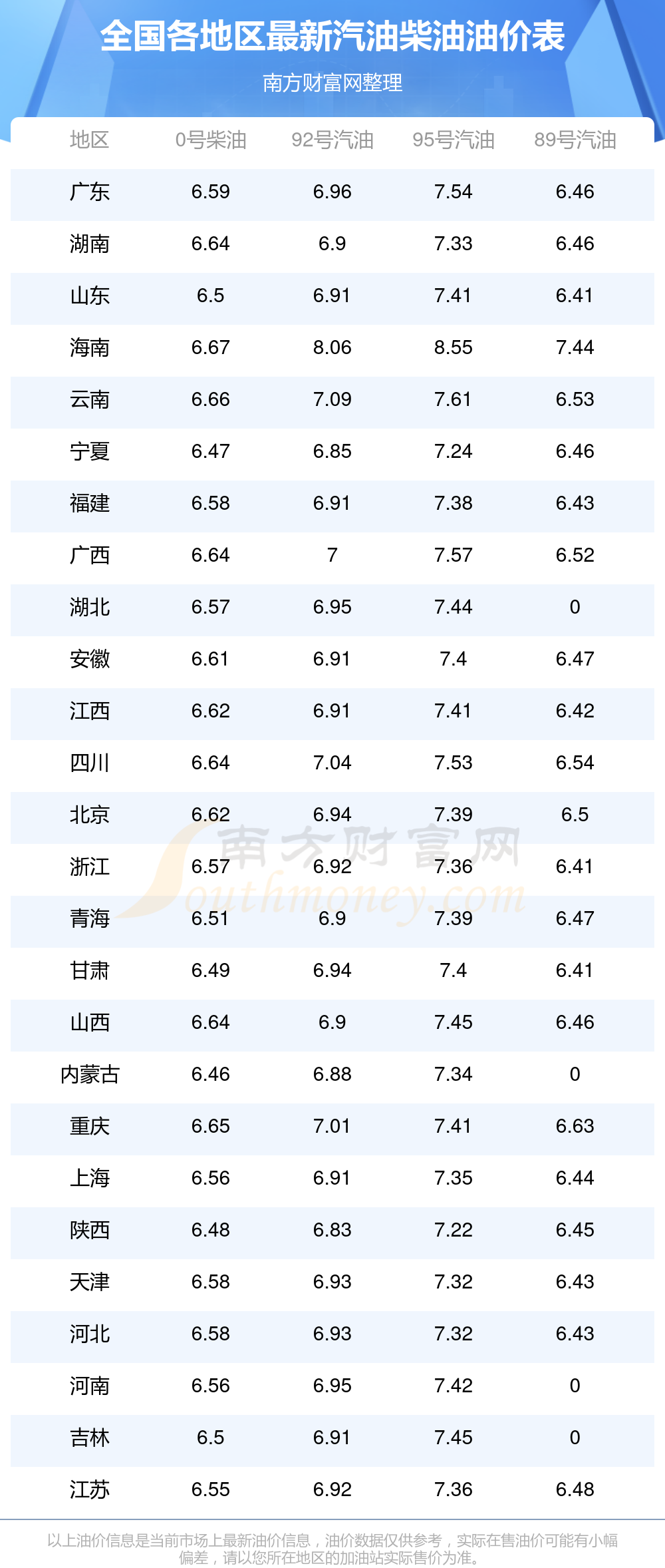 2025年全国各地区最新油价表