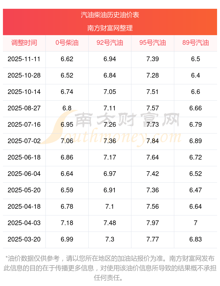 11月15日房山92号汽油的最新价格(11月11日调整后的价格):6.94元/升,相对上次调整涨了0.1元。下一轮油价调整时间11月24日24时,距离现在还有9.56天。