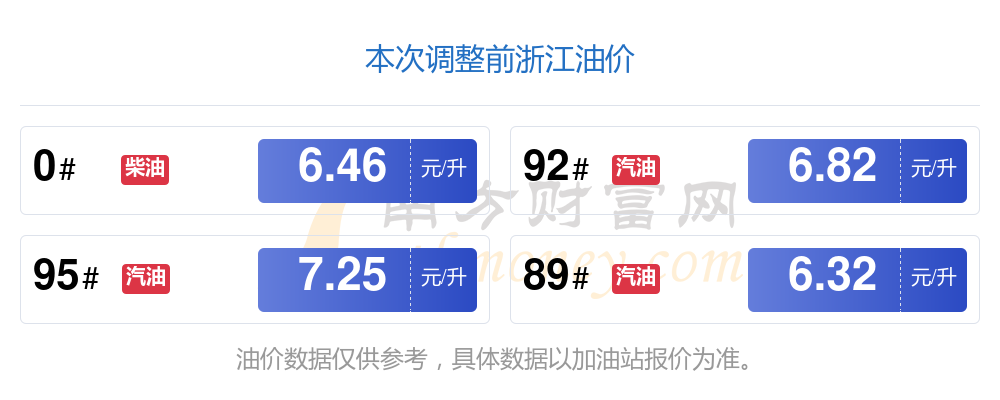 浙江95号汽油11月15日价格为7.36元每升,本次油价调整时间是11月11日,相对上次调整后10月28日的油价是7.25元/升,上调了0.11元,上调幅为1.517%。