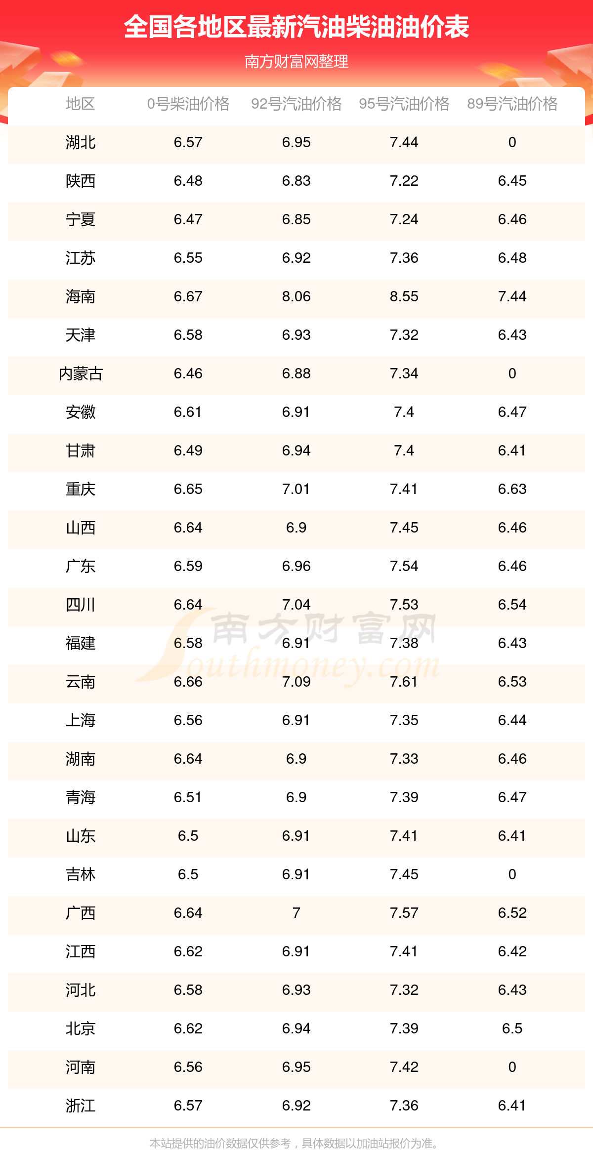 11月15日全国92号汽油每升的价格:调整时间为11月11日,平均价格为7元/升,最低的是陕西,价格6.83元/升,最高的是海南,价格8.06元/升。下一轮油价调整时间11月24日24时,距离现在还有9.55天。