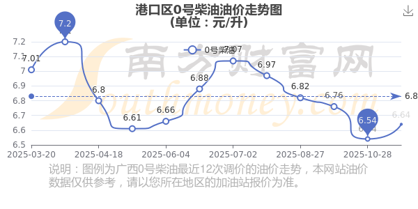 11月15日港口区0号柴油的最新价格(11月11日调整后的价格):6.64元/升,相对上次调整上涨了0.1元。