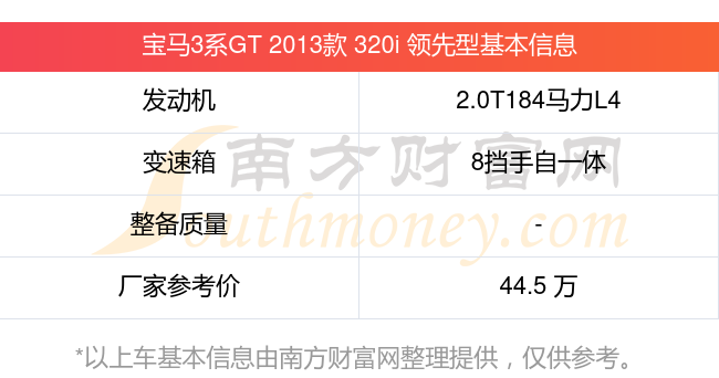 在动力方面,宝马3系GT 2013款 320i 领先型搭载的是一台2.0T184马力L4涡轮增压发动机,匹配8挡手自一体自动档变速箱,燃料形式为汽油,厂家参考价44.5万元。