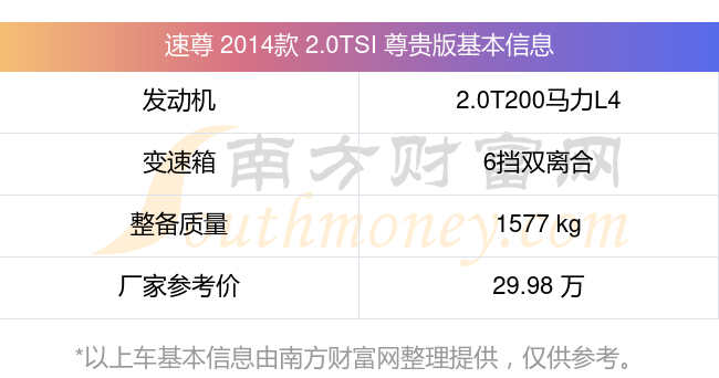速尊 2014款 2.0TSI 尊贵版动力上配备的是一台2.0T200马力L4涡轮增压发动机,匹配的是6挡双离合自动档变速箱,燃料形式为汽油,常规整备质量1577kg,厂家参考价29.98万元。