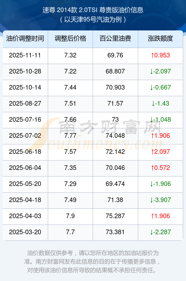 按照11月11日95号汽油最新调整价格7.32元/升来计算(以天津为例),该车型百公里平均油费为69.76元,按照上一轮10月28日调整价格7.22元/升来计算,百公里平均油费为68.807元,对比上一轮多花0.953元,下一轮油价调整时间为11月24日24时。