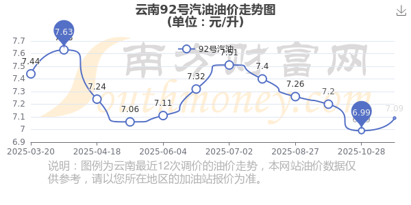 汽油价格调整最新消息:下一轮油价调整时间11月24日24时。11月15日云南汽油、柴油的价格为11月11日调整后的价格。每升最新价格为:92号汽油7.09元,涨了0.1元;95号汽油7.61元,涨了0.11元;89号汽油6.53元,涨了0.1;0号柴油6.66元,涨了0.1元。