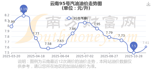 11月15日,云南95号汽油的价格是7.61元每升,本次的调整时间为11月11日,对比上次的调整升了0.11元,升1.467%,下次调整时间为11月24日24时,还有9.52天。
