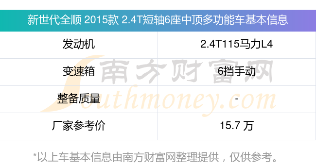 在动力上,新世代全顺 2015款 2.4T短轴6座中顶多功能车配备的是一台2.4T115马力L4涡轮增压发动机,匹配的是6挡手动挡变速箱,燃料形式为柴油,厂家参考价15.7万元。