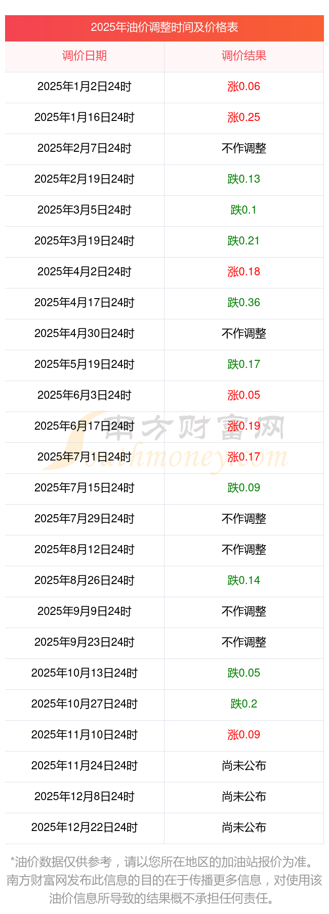 11月15日,东莞沙田镇汽油、柴油每升最新价格为:92号汽油为6.96元,涨了0.1元;95号汽油为7.54元,涨了0.11元;89号汽油为6.46元,涨了0.09元;0号柴油为6.59元,涨了0.1元,调整时间为11月11日。下一轮油价调整时间11月24日24时。
