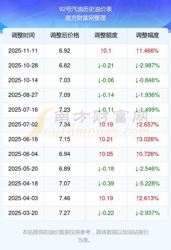 汽油、柴油11月15日价格多少钱一升?具体为:0号柴油为6.55元,涨了0.11元;95号汽油为7.36元;92号汽油为6.92元;89号汽油为6.48元,调整时间为11月11日。下一轮油价调整时间11月24日24时,距离现在还有9.52天。