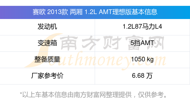 在动力方面,赛欧 2013款 两厢 1.2L AMT理想版搭载的是一台1.2L87马力L4自然吸气发动机,匹配5挡AMT自动档变速箱,燃料形式为汽油,常规整备质量1050kg,厂家参考价6.68万元。