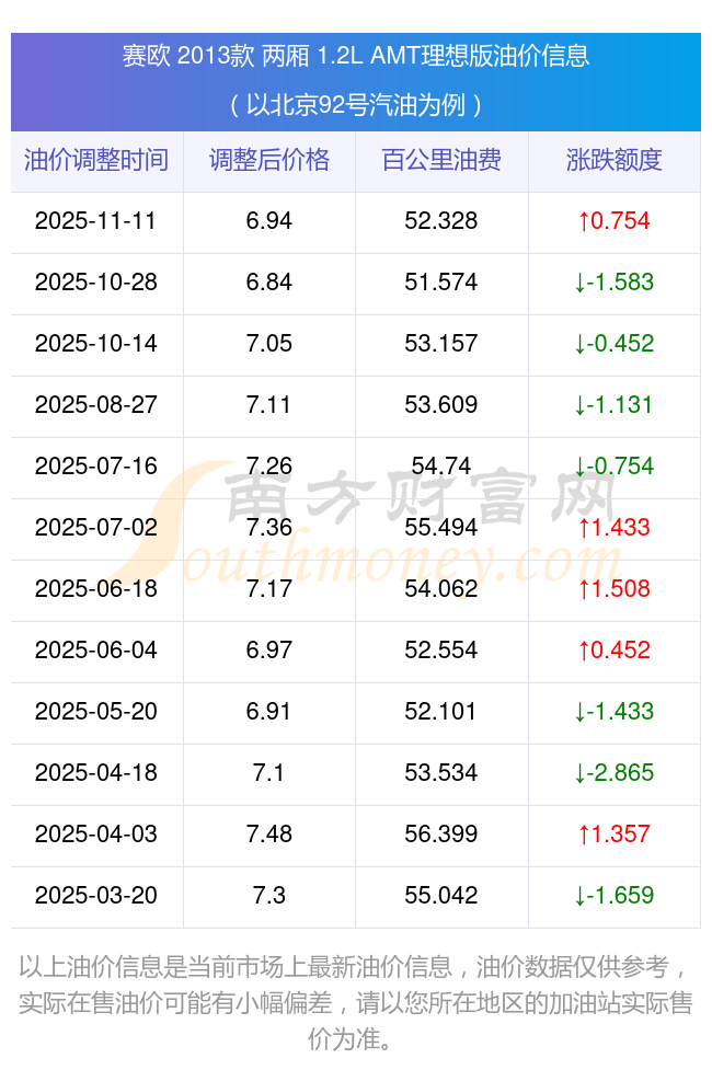 按11月11日92号汽油最新调整价格6.94元每升来计算(以北京为例),该车型百公里平均油费为52.328元,按上一轮10月28日调整价格6.84元每升来计算,百公里平均油费为51.574元,对比上一轮多花0.754元,下一轮油价调整时间为11月24日24时。