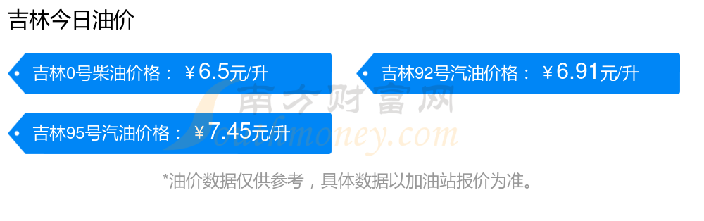 11月15日吉林汽油、柴油每升的最新价格:92号汽油6.91元;95号汽油7.45元;0号柴油6.5元,本轮油价的调整时间是11月11日。