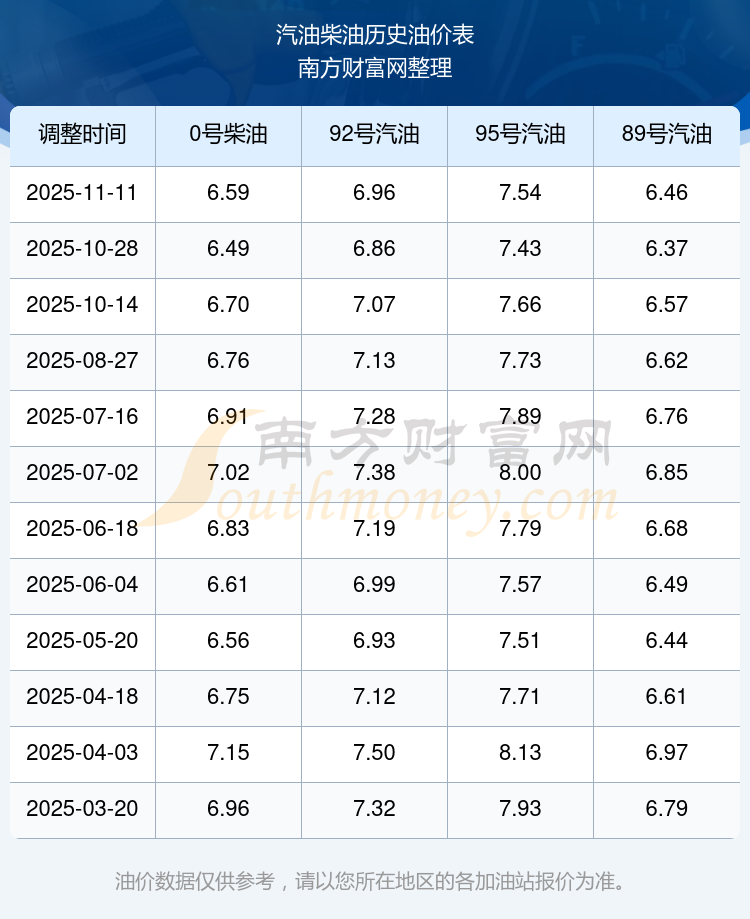 广州汽油、柴油11月15日的价格是多少钱一升?具体如下:92号汽油为6.96元,升了0.1元;95号汽油为7.54元,升了0.11元;89号汽油为6.46元,升了0.09元;0号柴油为6.59元,升了0.1元,本轮油价的调整时间为11月11日。下一轮油价调整时间11月24日24时,距离现在还有9.5天。