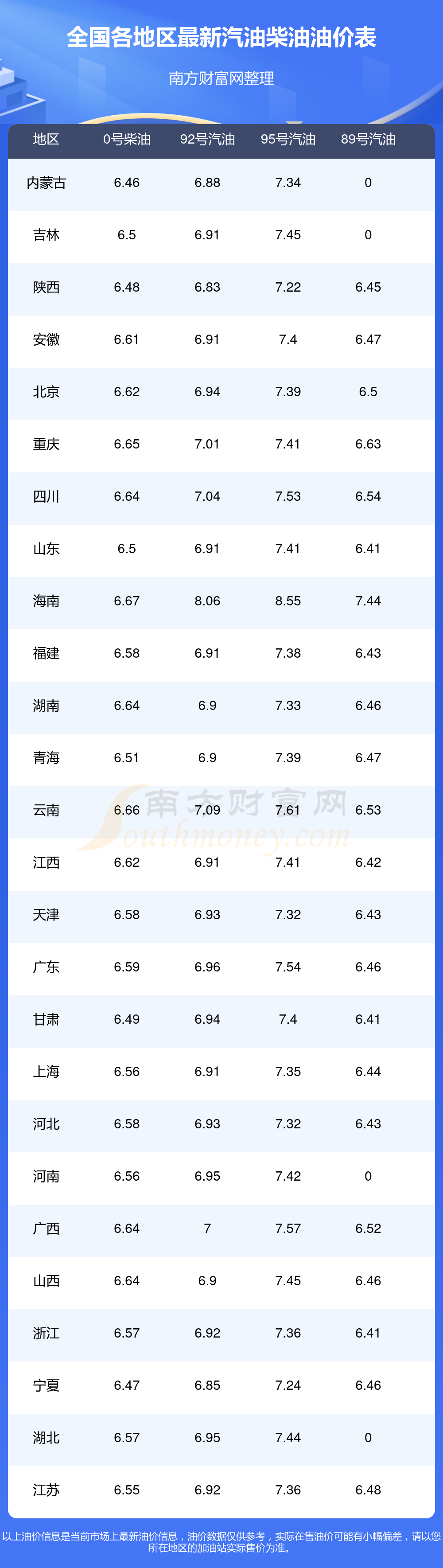 油价调整最新消息:油价最新调整时间为11月11日 ,全国92号汽油最新平均价格为:7元每升,其中,最高为海南,价格为8.06元/升,最低为陕西,价格为6.83元/升。全国95号汽油最新平均价格为:7元每升,其中,最高为海南,价格为8.55元/升,最低为陕西,价格为7.22元/升。全国0号柴油最新平均价格为:7元每升,其中,最高为海南,价格为6.67元/升,最低为内蒙古,价格为6.46元/升。全国89号汽油最新平均价格为:7元每升,其中,最高为海南,价格为7.44元/升,最低为浙江,价格为6.41元/升。下一轮汽油价格调整时间11月24日24时,距离现在还有9.5天。