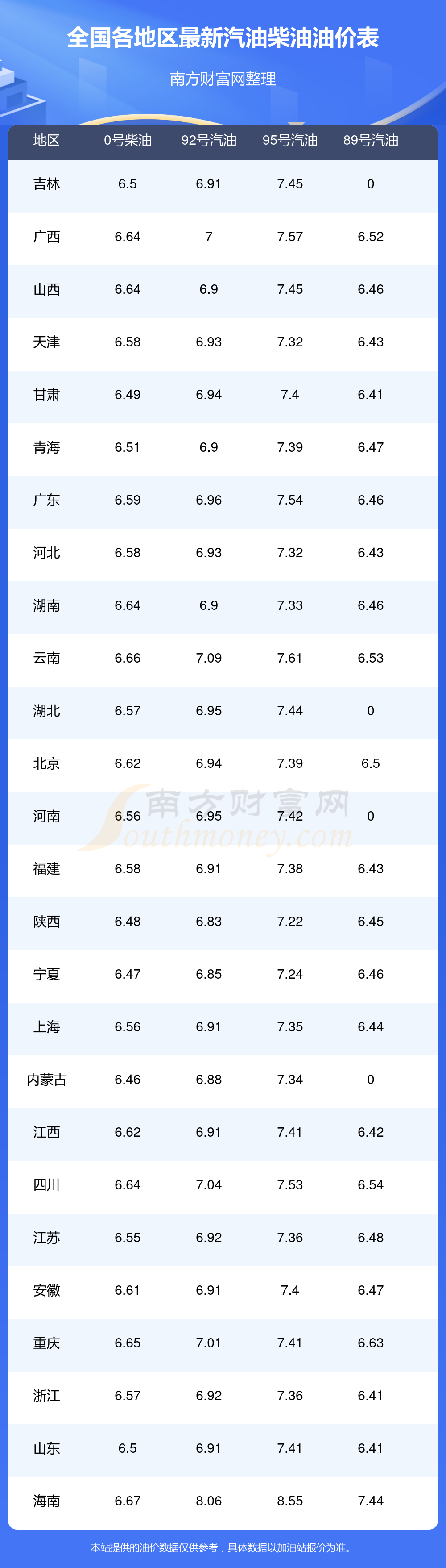 以上油价信息是当前市场上最新油价信息,油价数据仅供参考,实际在售油价可能有小幅偏差,请以您所在地区的加油站实际售价为准。