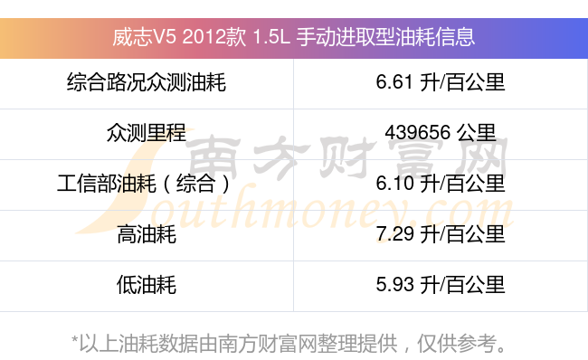 根据多位车主实测得出数据,该车型低油耗为5.93L/100km,高油耗为7.29L/100km,综合路况众测油耗为6.61L/100km,工信部综合油耗为6.10L/100km。