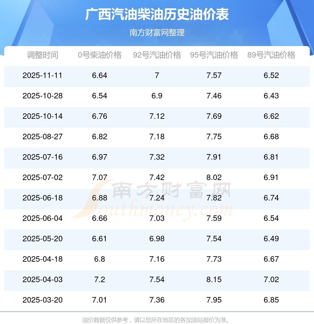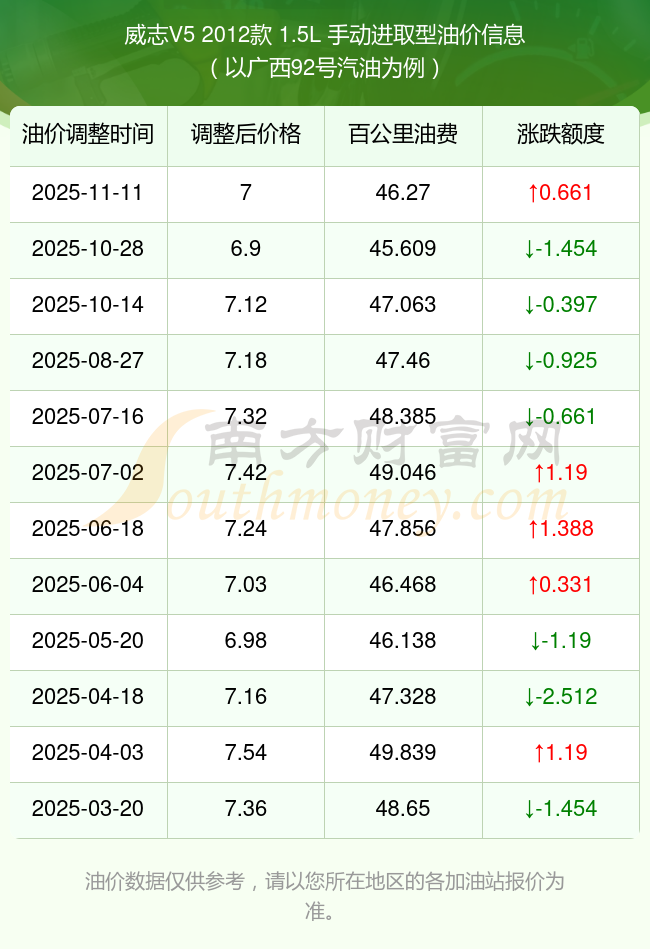 依照11月11日92号汽油最新调整价格7元/升来计算(以广西为例),该车型百公里的平均油费是46.27元,依照上一轮10月28日调整价格6.9元/升来计算,百公里的平均油费是45.609元,对比上一轮多花0.661元,下一轮的油价调整时间11月24日24时。