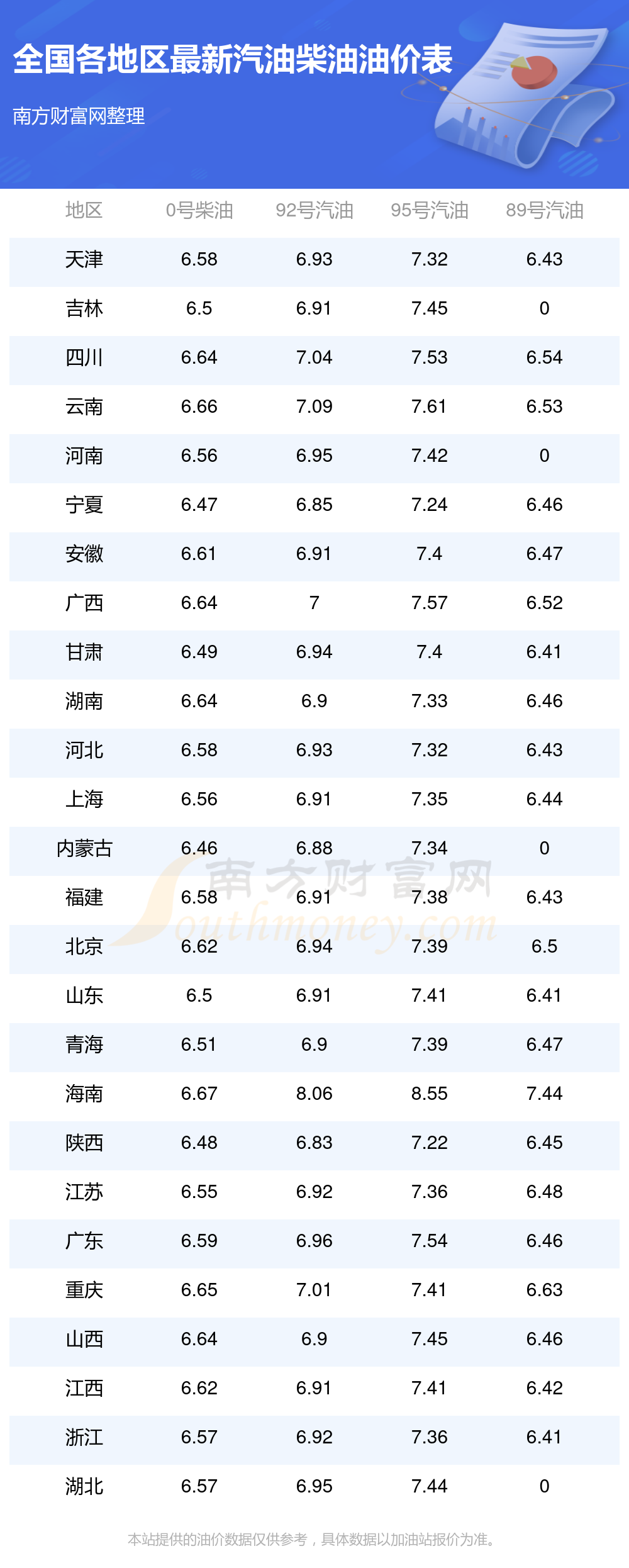 油价数据仅供参考,请以您所在地区的各加油站报价为准。