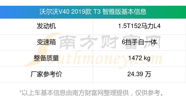 沃尔沃V40 2019款 T3 智雅版动力上搭载的是一台1.5T152马力L4涡轮增压发动机,匹配6挡手自一体自动档变速箱,燃料形式为汽油,常规整备质量1472kg,厂家参考价24.39万元。