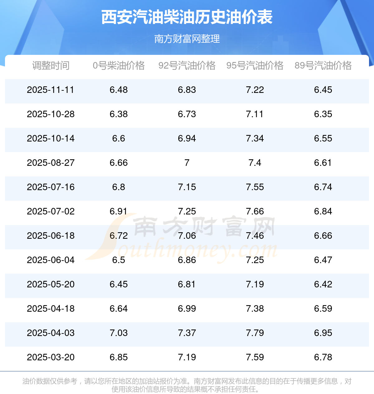 西安汽油、柴油11月15日每升的价格具体是(11月11日调整后的价格):92号汽油6.83元;95号汽油7.22元;89号汽油6.45元;0号柴油6.48元。