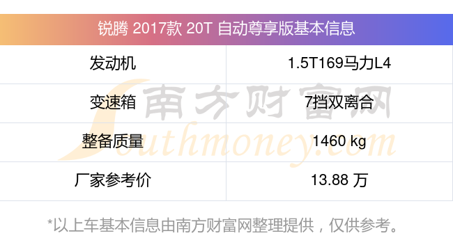 锐腾 2017款 20T 自动尊享版动力上搭载的是一台1.5T169马力L4涡轮增压发动机,匹配7挡双离合自动档变速箱,燃料形式为汽油,常规整备质量1460kg,厂家参考价13.88万元。