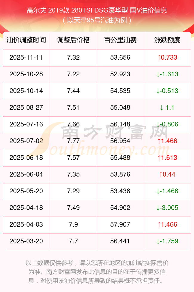 按11月11日95号汽油最新调整价格7.32元每升来计算(以天津为例),该车型百公里平均油费为53.656元,按上一轮10月28日调整价格7.22元每升来计算,百公里平均油费为52.923元,对比上一轮多花0.733元,下一轮油价调整时间为11月24日24时。