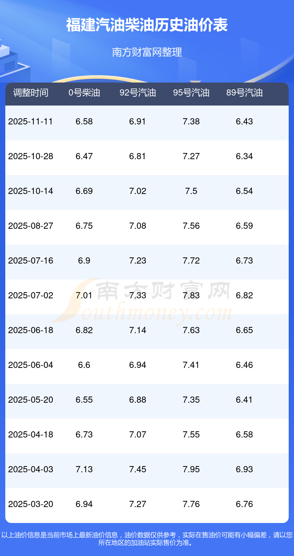 11月15日,福建95号汽油的最新价格为7.38元/升,油价调整时间是11月11日,对比上一轮调整共上调了0.11元,上调1.513%。