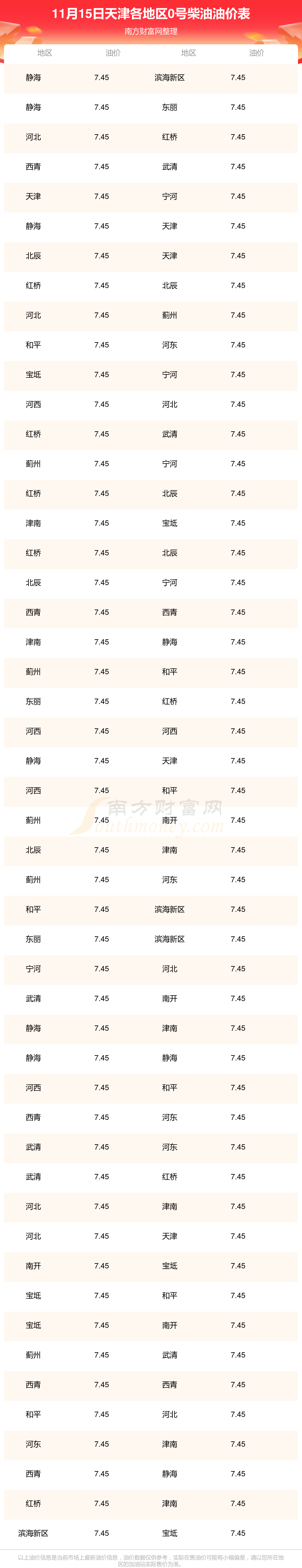 11月15日,天津0号柴油的价格是6.58元每升,本次的调整时间为11月11日,对比上次的调整上升了0.11元,上升1.7%,下次调整时间为11月24日24时,还有9.48天。