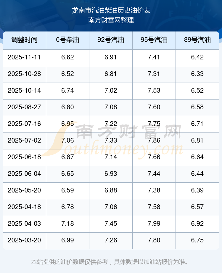 2025年龙南市油价调整时间表