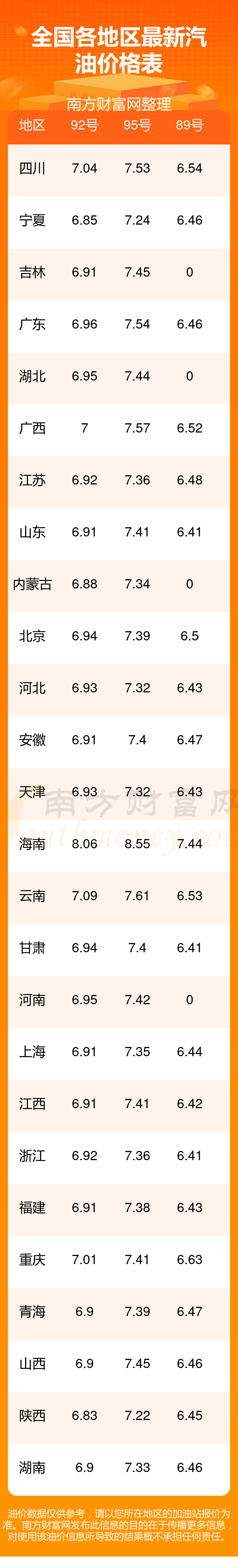油价调整最新消息:油价最新调整时间为11月11日 ,全国92号汽油最新平均价格为:7元每升,其中,最高为海南,价格为8.06元/升,最低为陕西,价格为6.83元/升。全国95号汽油最新平均价格为:7元每升,其中,最高为海南,价格为8.55元/升,最低为陕西,价格为7.22元/升。全国0号柴油最新平均价格为:7元每升,其中,最高为海南,价格为6.67元/升,最低为内蒙古,价格为6.46元/升。全国89号汽油最新平均价格为:7元每升,其中,最高为海南,价格为7.44元/升,最低为浙江,价格为6.41元/升。下一轮汽油价格调整时间11月24日24时,距离现在还有9.47天。