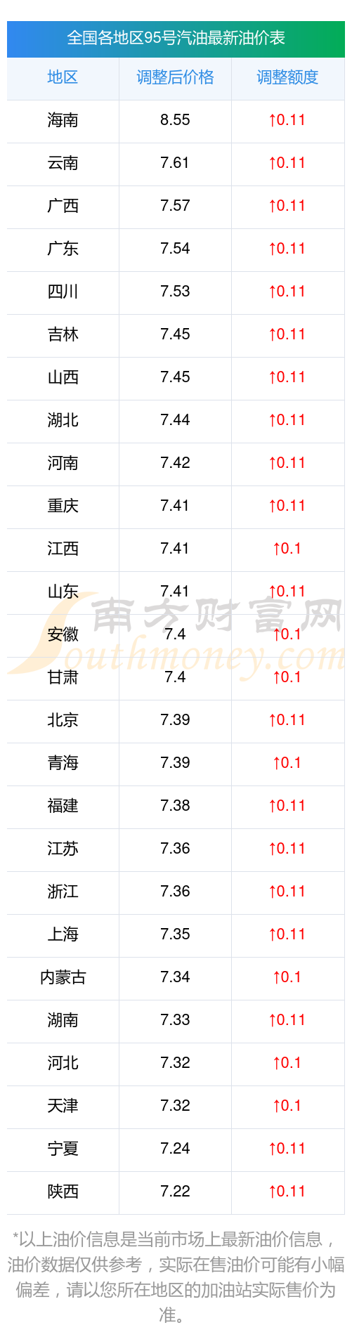 本轮油价调整时间为11月11日 ,调整后全国油价详情为:
