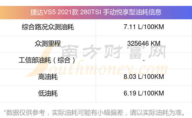 根据多位车主实测得出数据,该车型低油耗为6.19升每百公里,高油耗为8.03升每百公里,综合路况众测油耗为7.11升每百公里。