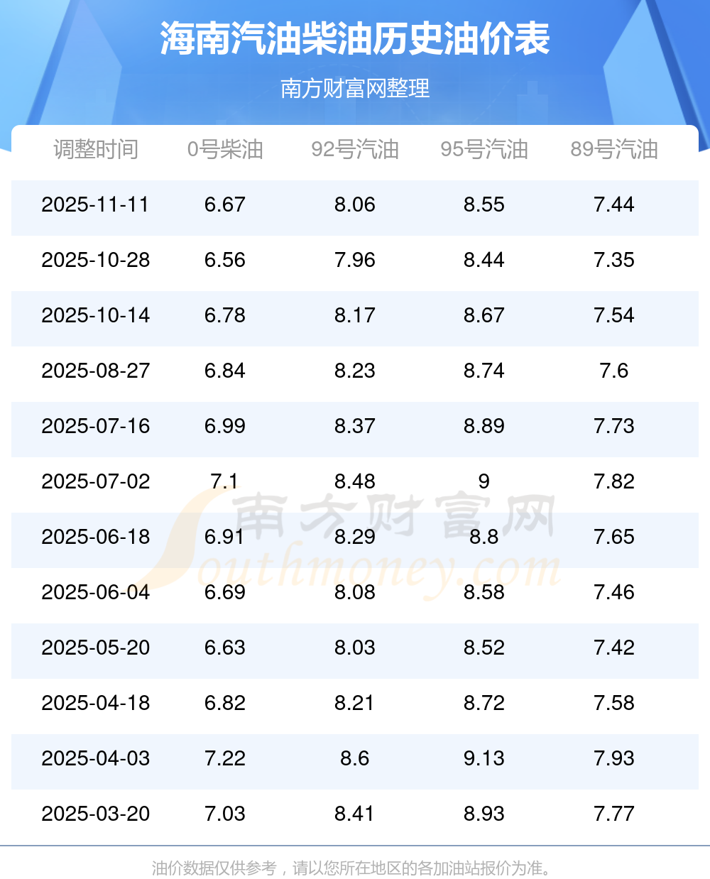 11月15日海南汽油、柴油每升的最新价格:92号汽油8.06元,上调了0.1元;95号汽油8.55元,上调了0.11元;89号汽油7.44元,上调了0.09;0号柴油为6.67元,上调了0.11元,本次油价调整时间是11月11日。