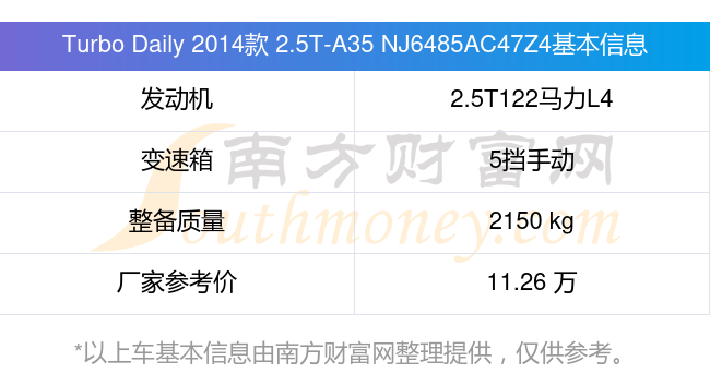 Turbo Daily 2014款 2.5T-A35 NJ6485AC47Z4搭载了一台2.5T122马力L4涡轮增压发动机,采用5挡手动挡变速箱,常规整备质量2150kg,厂家参考价11.26万元。