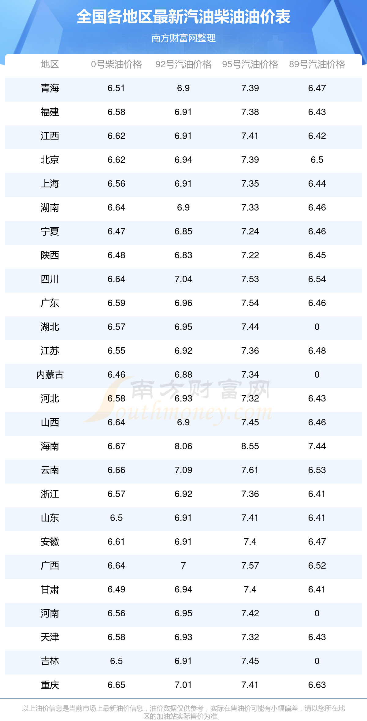 全国89号汽油最新平均价格为:7元每升,其中,最高为海南,价格为7.44元/升,最低为浙江,价格为6.41元/升。