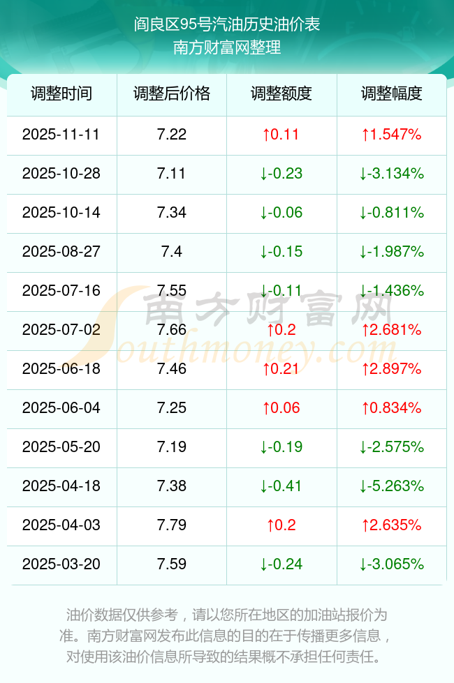 阎良区95号汽油11月15日的最新价格为7.22元/升,调整时间为11月11日,相对上次调整上升了0.11元。