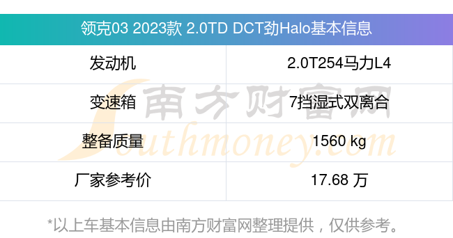 领克03 2023款 2.0TD DCT劲Halo动力方面,搭载的是一台2.0T254马力L4涡轮增压发动机,匹配7挡湿式双离合自动档变速箱,燃料形式为汽油,常规整备质量1560kg,厂家参考价17.68万元。