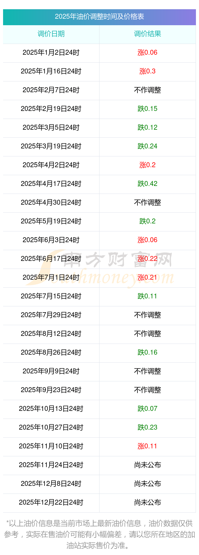 2025年阳西县11月15日汽油价格调整时间表