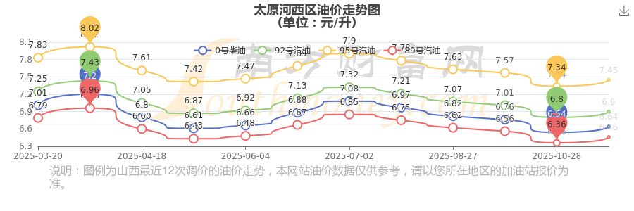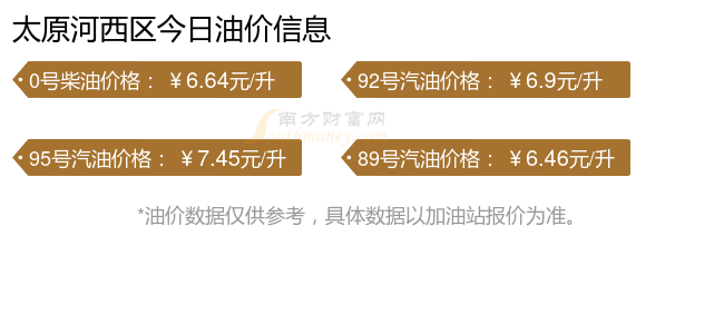 太原河西区汽油柴油11月15日的价格每升多少钱?具体为:92号汽油为6.9元,增了0.1元;95号汽油为7.45元,增了0.11元;89号汽油为6.46元,增了0.1元;0号柴油为6.64元,增了0.1元,本轮油价的调整时间为11月11日。