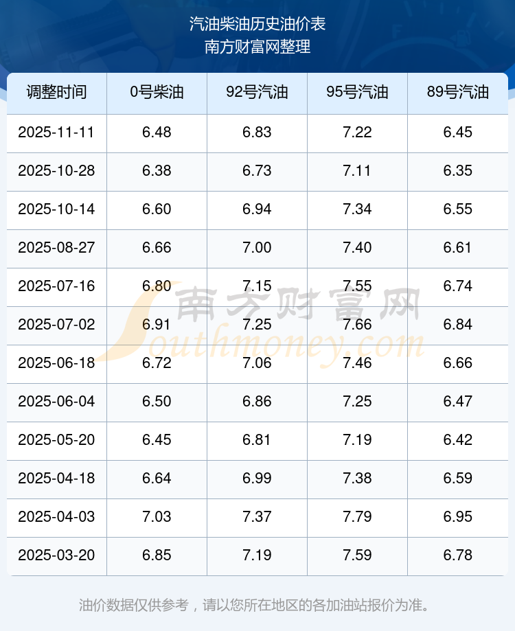 11月15日,宝鸡92号汽油最新价格为6.83元/升,调整时间为11月11日,相对上次调整涨了0.1元。下一轮油价调整时间11月24日24时,距离现在还有9.1天。