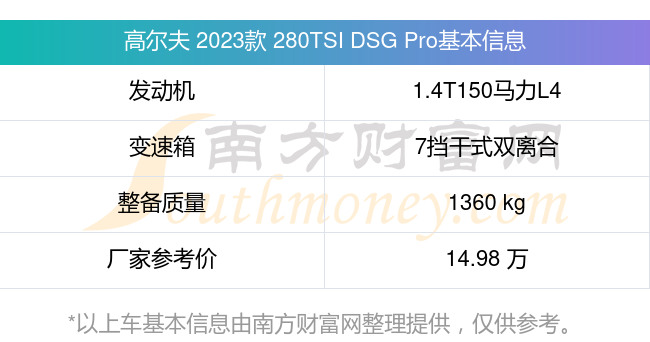 高尔夫 2023款 280TSI DSG Pro动力方面,搭载的是一台1.4T150马力L4涡轮增压发动机,匹配7挡干式双离合自动档变速箱,燃料形式为汽油,常规整备质量1360kg,厂家参考价14.98万元。