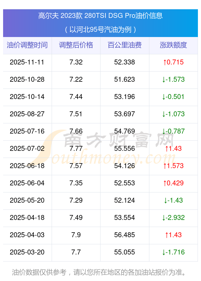 依照11月11日95号汽油最新调整价格7.32元/升来计算(以河北为例),该车型百公里的平均油费是52.338元,依照上一轮10月28日调整价格7.22元/升来计算,百公里的平均油费是51.623元,对比上一轮多花0.715元,下一轮的油价调整时间11月24日24时。